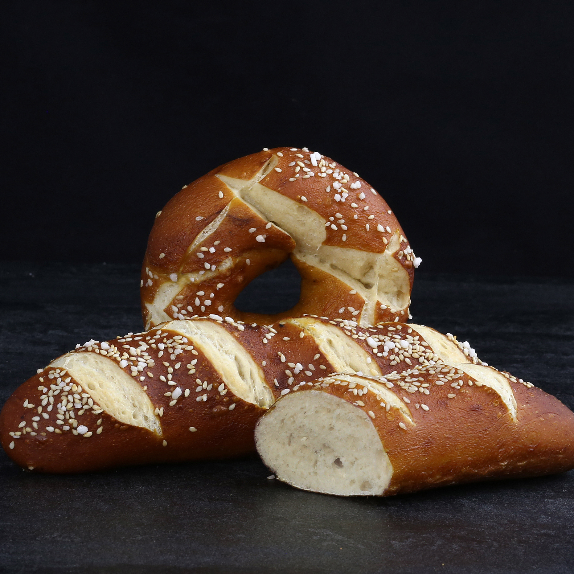 In Süd-Deutschland als klassisches Brötchen oder Brezel bekannt, stellen wir unser Laugengebäck als Stange und Kringel her. Der Teig reift mehr als 15 Stunden, vor dem Backen kommt Natronlauge auf die Oberfläche. Sie sorgt für den speziellen Geschmack. Sesam und Hagelsalz als Topping runden den Geschmack ab. Sehr beliebt auch bei Kindern.